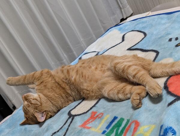 大きくて全身茶トラ警戒心強く綺麗好きトイレが汚れていると容器縁に乗り用を足す。嬉しいと大きな身体でゴロゴロ転がって表現、おもちゃ好き。炬燵も。優しくてマイペース。食欲旺盛。長い尻尾。