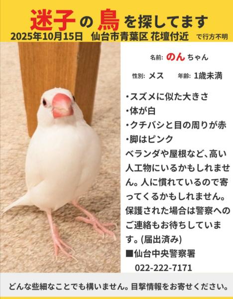 飼い主さんが迷子鳥を探しています。情報がありましたらお知らせいただきますようお願いします。
