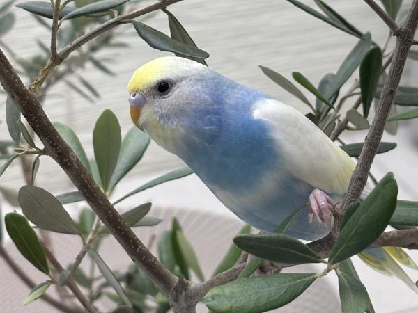 頭と羽がイエローで、背中とお腹が水色と白の模様が特徴です。