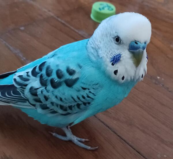 頭は白色でトップに水色のラインあります。羽根には黒の模様がはいっています。自分の名前をぽっぼっておしゃべりします。