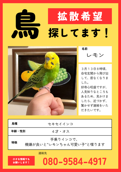 こちらの迷子鳥が見つかるようにSNSでの拡散のご協力をお願いいたします。