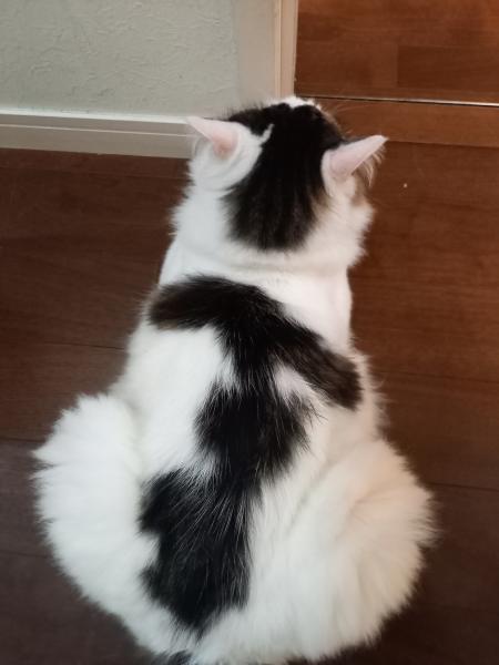 背中に英語のTのような柄があります。シッポは短めです。首輪はつけてません。長毛です。