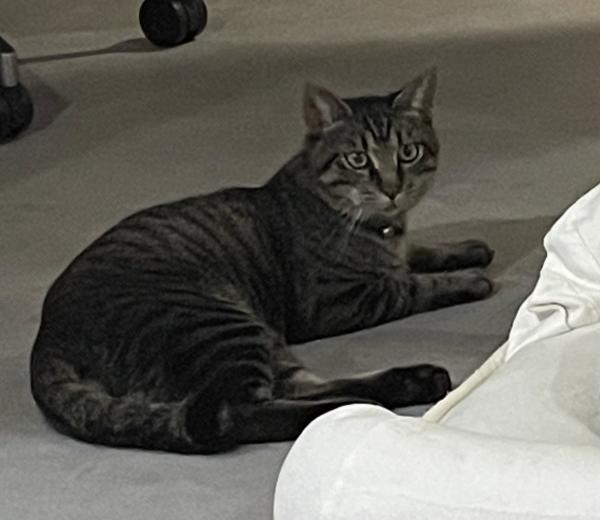 目が鋭く黒が強めのサバトラで、脇腹あたりの虎柄は途切れ途切れです。とてもビビりなので暗くて狭いところに入ろうとします。しっぽは鍵しっぽですが、曲がっているのは先端だけなので一見長尾出先が下部になってるように見えます。失踪時には黄色の革製の首輪をつけておりました(鈴付、猫の名前と電話番号が記載)