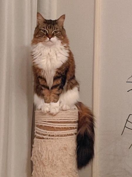 体長50cmほどの大きな猫です。体重5kg。長毛、首輪なし、人懐っこく穏やか。