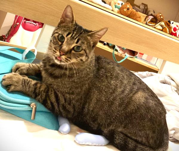 舌をしまい忘れがちで前足をよくフミフミしています。