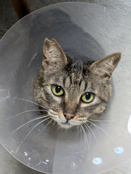 キジトラのオス 右:さくら耳 短めのかぎしっぽ 右頬一部はげ 口内上あごに黒いあざ