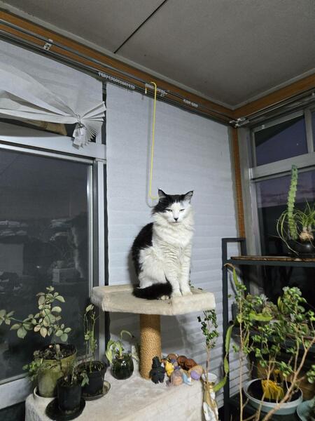 白と黒の長毛のコロミちゃん(コロちゃん)といいます。顔のおでこあたりから背中と尻尾と肉球が黒いです。