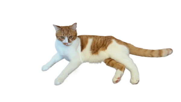 茶白の顔からしっぽまでの背中部分が茶トラ柄であごからお尻にかけてお腹部分と両手右足が白く、少し長毛種に近い毛並みで、ピンっとした長いしっぽが特徴です。