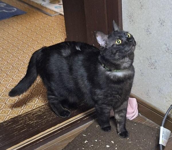 外側は黒毛で内側が白いマダラな感じの黒猫です。尻尾は長くまっすぐ 目が丸く目力があります。緑の唐草模様の首輪をしてますが外れている可能性も。可愛い声で鳴きます。